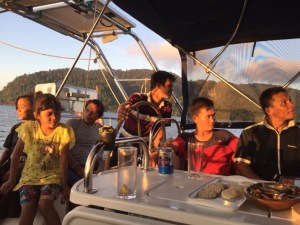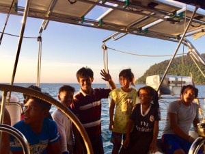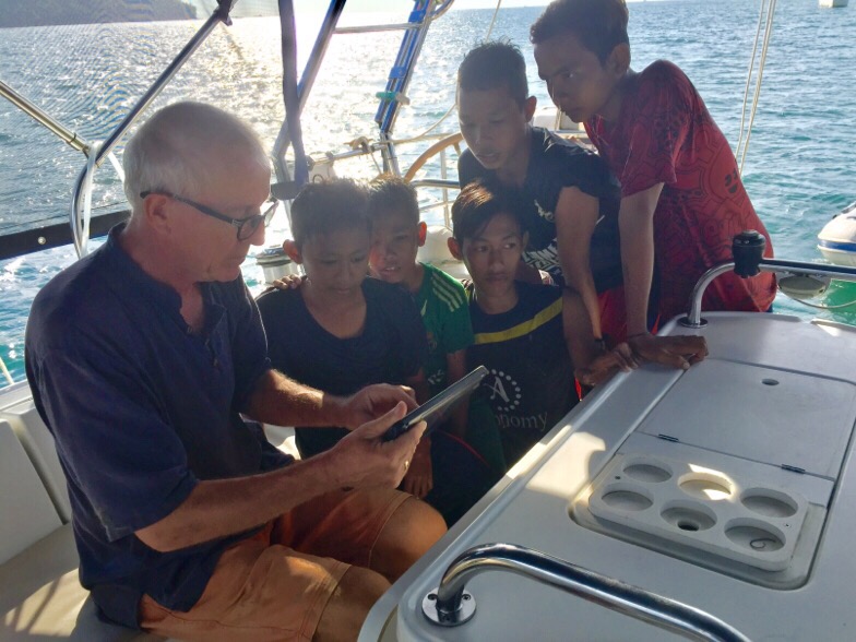 A quick navigation lesson taking placeBest of all they loved their ride in our dinghy. As it had taken them such a long time to get to the boat Capt’n Birdseye decided to take them back, towing the dugouts behind him.