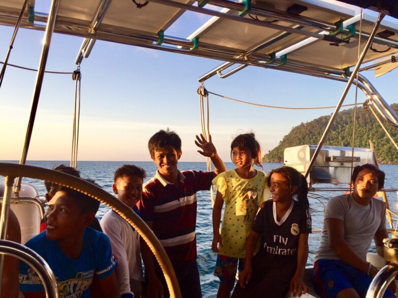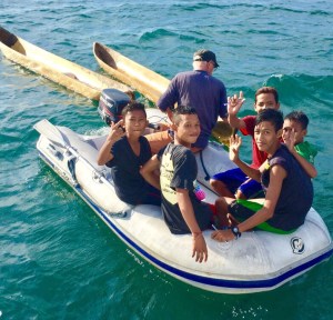 After a long paddle out these boys were thrilled to be invited aboardThey were so excited to meet us and enthralled with everything on the boat – the electronic chart plotters, the radio, the water maker – it was all fascinating to them. We gave them each a notebook and pen and they enjoyed using Bali Hai’s engraved stamp and ink pad on the inside covers (and on themselves)!