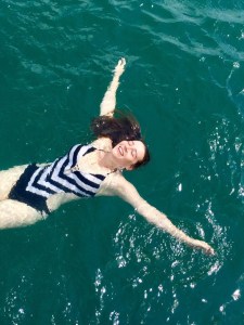 This group thought the chart plotter was amazingAfter our guests left it was time for a swim. There was a huge current running but undaunted, our daughter jumped in at the bow of the boat and allowed the current to carry her down to the stern where we had a rope for her to grab. The dinghy was at the ready to go and retrieve her if she missed!