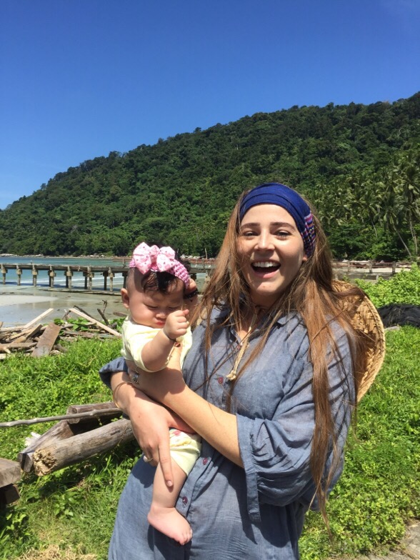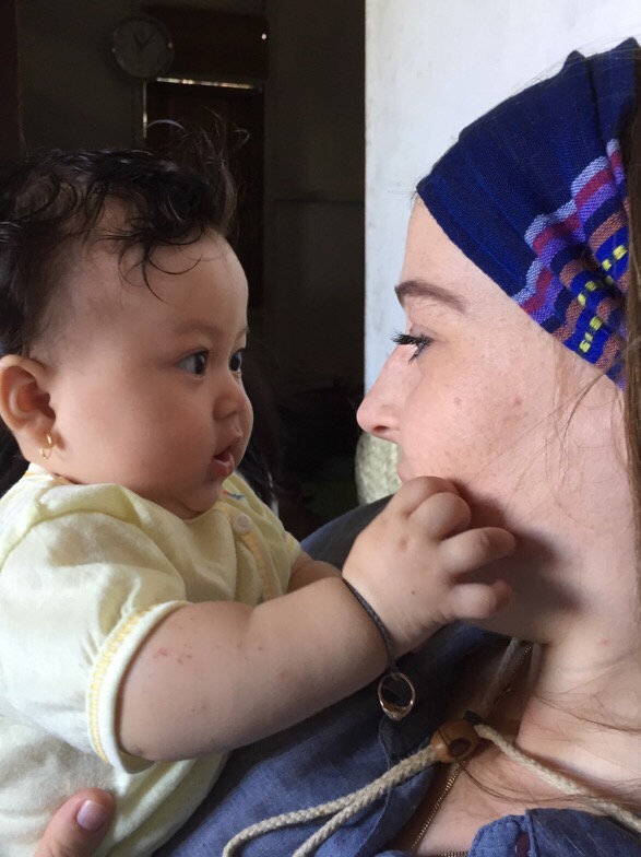 Our daughter with the Chief’s babyWe were invited in to her family house and sat on the floor of their front room (amongst bowls and sacks of dried fish) while her husband shinned up a coconut palm to fetch us fresh coconut water to drink watched eagerly from the door way by lots of curious children.