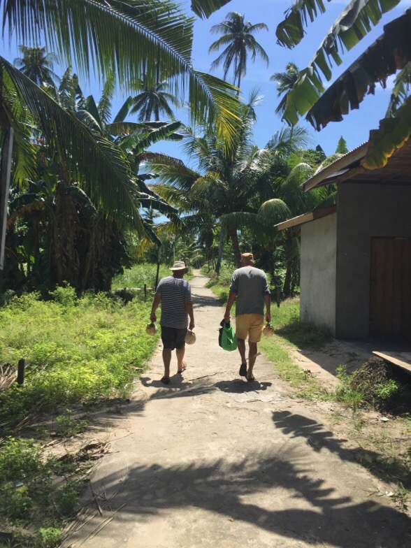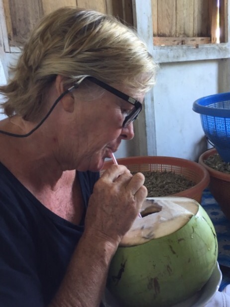 Jill enjoying fresh coconut waterAfter more photo taking and gifts of coconuts and bananas from the Chief’s family, we wound our way back to the beach where we had left the dinghies, meeting friendly villagers as we walked.