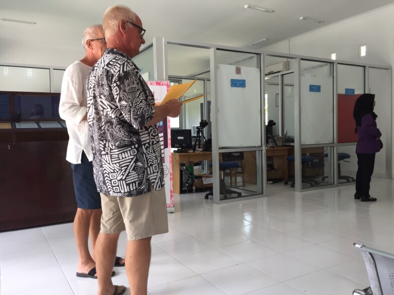 Form filling at the Immigration OfficeAs we stepped into the air conditioned cool of the Immigration Office we realised this could be a long process – the place was crowded with people, some local people I think were applying for passports, others possibly for work visas. We were given some forms to fill out (which required information about our sponsor and a copy of our original sponsor letter) and then were told to go next door to the stationery shop and buy each of us a red folder.