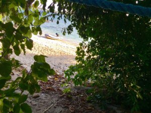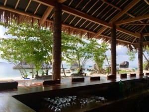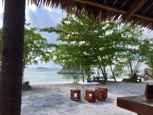 Crabby Hut – very posh compared with all of he other warungsUnusually for this part of the world the buildings were designed to please the most discerning tourist – an open-sided bar, thatched roof surrounded by palm trees, white sand and trimmed gardens.
