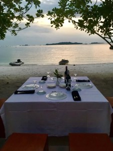 This is not a sight you see often in IndonesiaThere on the white sand was a beautifully laid candle-lit table complete with white tablecloth, sparkling silverware, long stem wine glasses and everything just so.