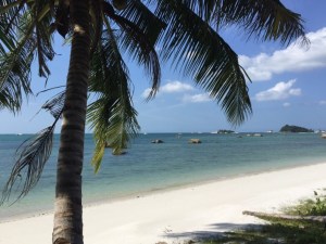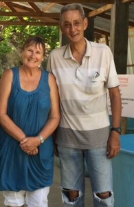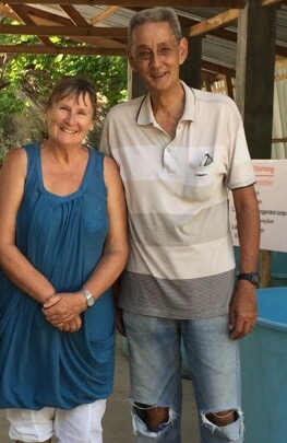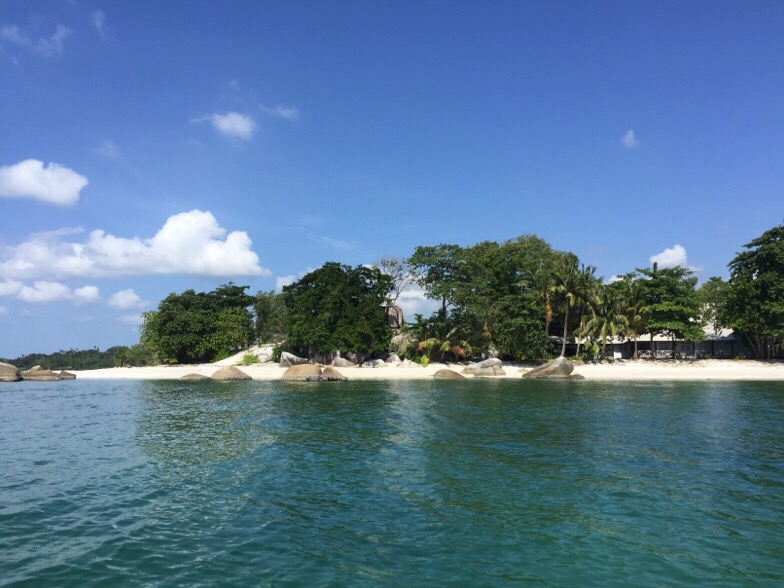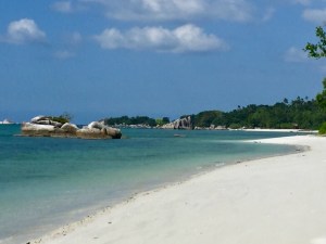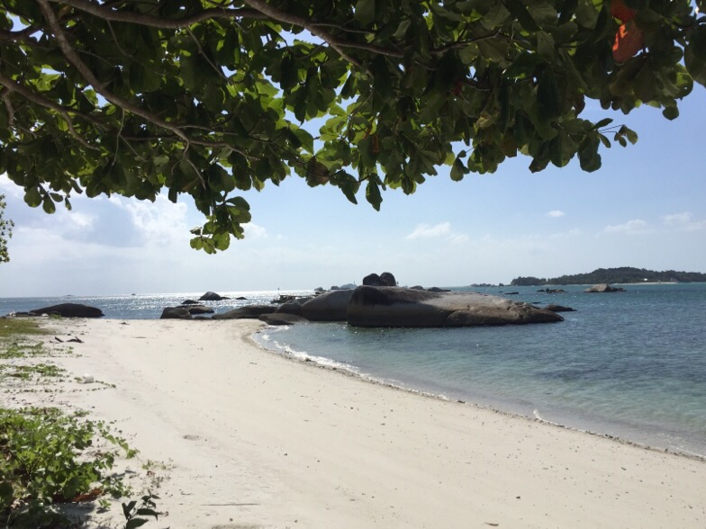 The Yantara’s, Glenn and meAfter our visit we took the dinghy to explore the beautiful white sand beach on Belitung that we could see from our anchorage where a rather elegant balconied building hid behind palm trees and granite rocks.