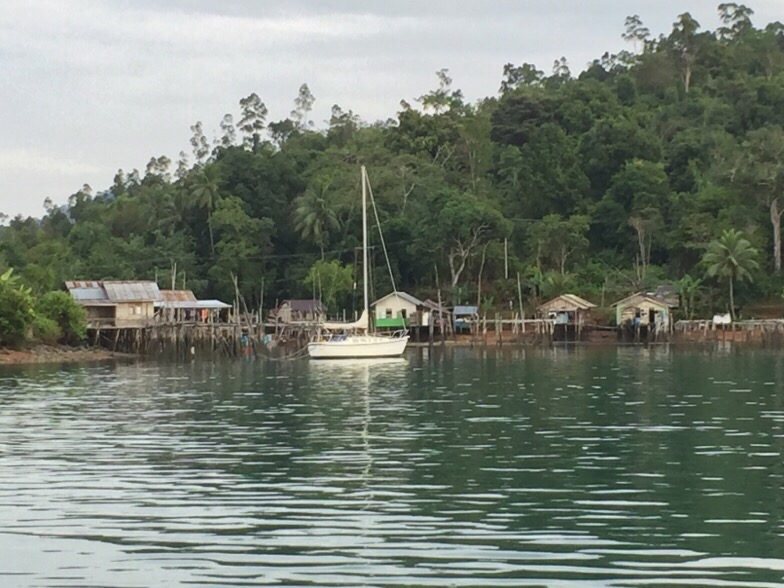 One of the many fishing huts we encountered on this tripOur first overnight stop was at Tanjung Kelit on Pulau Lingga, just round the corner from the little cove where in 2015 a lot of the rally boats had thrown an excellent Equator Party. (https://dotsailing.wordpress.com/2015/11/23/crossing-the-equator-aargh-jim-lad/)