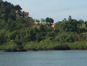 A small fishing boat near the EquatorWe eventually settled in a channel that had reasonable and consistent depth – just level with the headland (Tanjung) and a structure on the end of it that we thought was a Chinese temple.