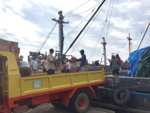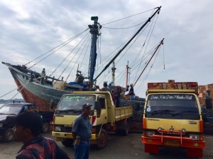 Unloading by handFrom where we were sitting in a stevedore’s cafe on the dock we could see our yachts anchored over on the other side of the harbour and enjoyed the comings and goings of this busy hive of industry.
