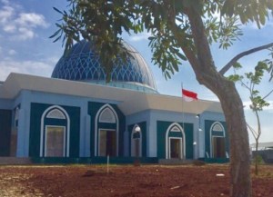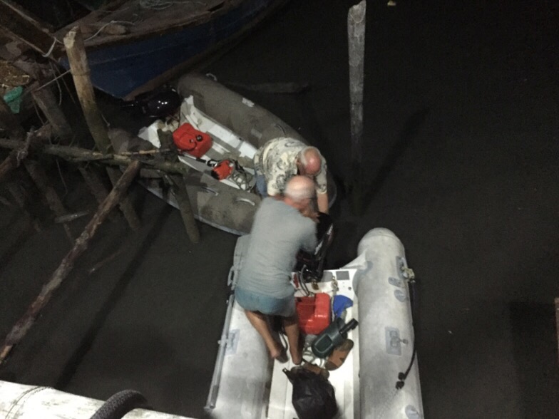 The new mosque on top of the hillLater that day ate a fabulous meal at Alim’s. The seafood couldn’t have been fresher and the whole evening was excellent until it was time to go. While we were enjoying our food and drink the tide had been busily going out. As it was full moon it went out even more than usual! Our dinghy engines were stuck firmly in the mud!!