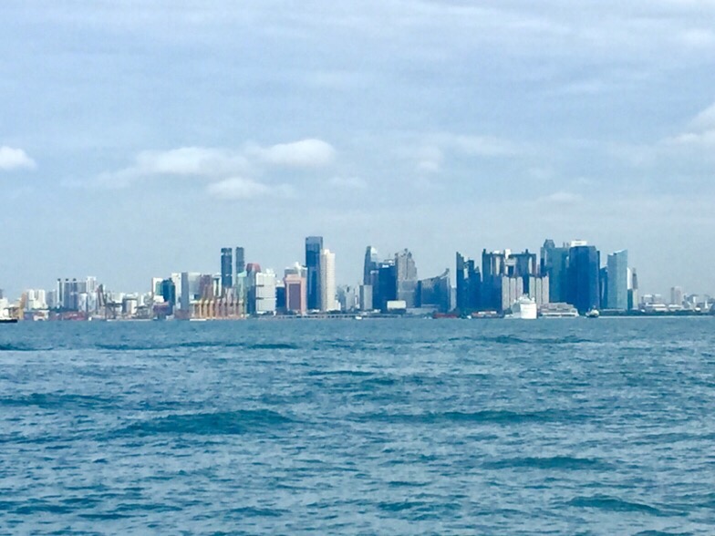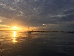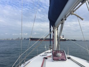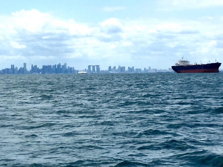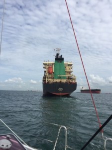 Dawn breaksThe Singapore Strait was surprisingly busy at first light (7am) and we had to do a fair bit of dodging, stopping, and moving in behind the giants plying the shipping lanes. It’s sort of like crossing a motorway with big trucks coming from both directions. Not scary really but you do have to be on the ball and watch carefully as some of those massive cargo vessels move extremely quickly – and they have no brakes so it is entirely up to you to take avoiding action!