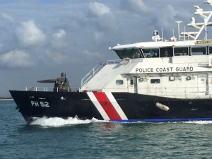 Think we’d better give way!The launch watched us from a distance and as we proceeded up the Strait between Malaysia and Singapore towards Puteri Marina, we noticed another Police Launch that was probably also monitoring our route.