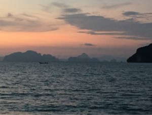 We anchored in one of our old haunts between two massive karsts with a wonderful view into the distance. We were longing to dive off the boat for a swim round the the boat and Capt’n Birdseye was keen to try his new full face snorkel mask. Although it looked rather strange he found it was excellent – much better visibility than a conventional mask and no need to blow through the snorkel when you come up from a duck dive.