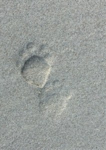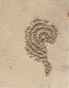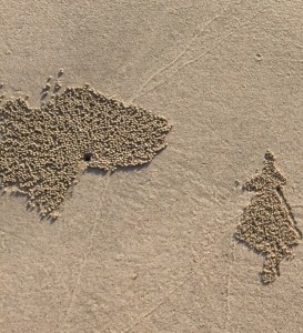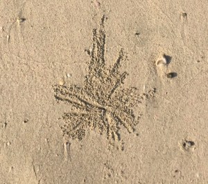 Our walk along the beach was interspersed with stops to examine the amazing patterns made by crabs (do they make this wonderful art in a conscious way?) and puzzle over footprints of strange animals.
