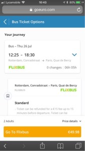 We had decided to go by train as we thought it would be a pleasant way to travel but being peak holiday time it was expensive and hard to find a booking that suited us. Our daughter suggested using Flixbus (apparently these run routes all over Europe and the USA) as a cheap alternative. We were amazed. The one way train ticket from Amsterdam to Paris would have cost EUR 120.22 each and the bus ticket was only EUR 49.98 for two! Better still the bus left from Rotterdam, nearer to our daughter’s and the terminus was close to the station (Gare de Bercy) where we were to take the train to Sens to collect the camper van.