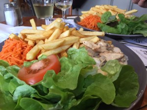 It was such a lovely evening that we took the bikes off their rack and went for a cycle ride down the long hill to the village. We found a pottery shop and a local hostelry which was open but couldn’t serve us a drink because the young teenaged boy explained, the “patron” was not there. Then for the long ride back up the hill again!