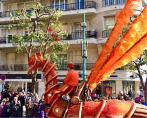 It was well worth the wait as there were some wonderful floats with fantasy figures made from oranges and lemons, mechanical dragons and other mythical animals, and live music provided by all kinds of acts including a rock group, drummers, a Japanese marching band and acrobats playing electric violins at the same time as propelling themselves upside down on wires.