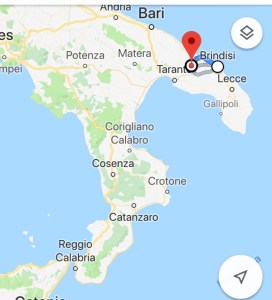 The ferry arrived in Brindisi after a calm crossing at 9.30 am and we drove straight to the designated campervan parking spot in the city to shower, eat breakfast and have a rest. We arrived to discover that it was heaving with cars and every designated campervan spot was taken (by cars not vans) – including the space allocated for dumping grey water. This was our introduction to road rules in Italy – they are there to be ignored!