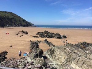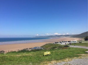 After a great weekend at the wedding venue in Middle Marwood we traversed the super-narrow high hedged lanes (seriously narrow – our camper only just squeezed through and at one point we lost part of the rear mudguard on a tree root) and made our way to the nearby surfing beach of Woolacombe.