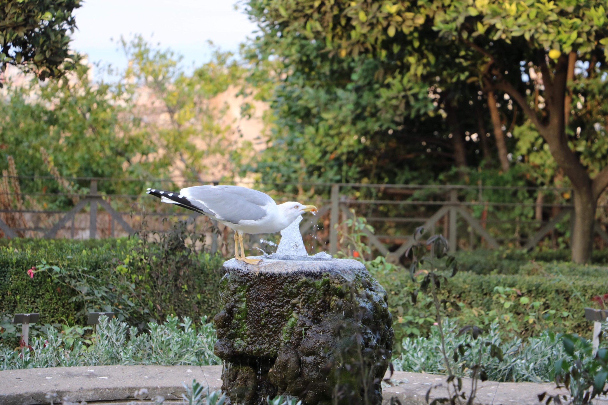A seagull enjoys a fountain in the Farnese Gardens (photo Peter Hannigan)