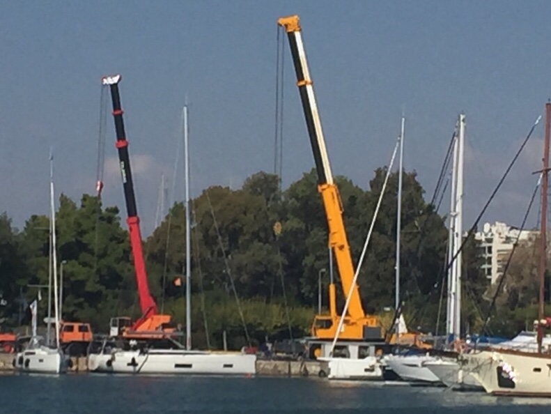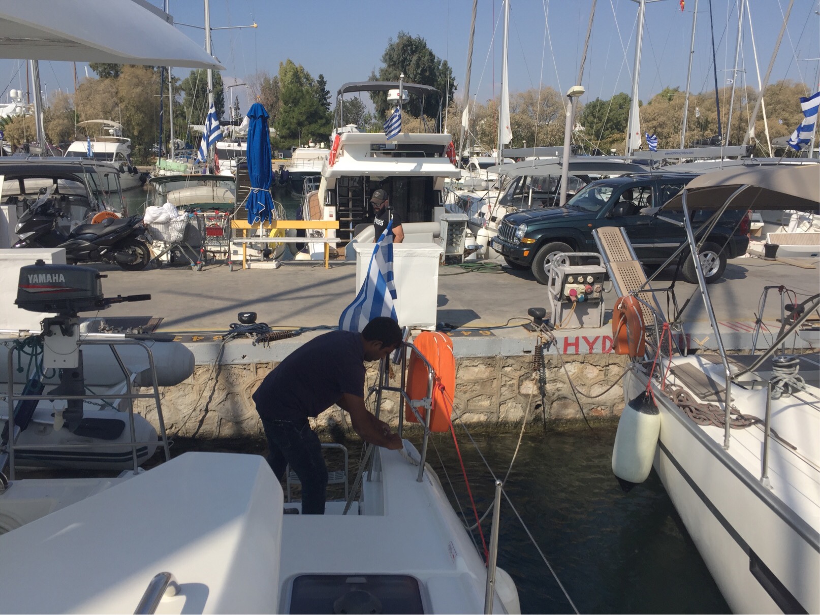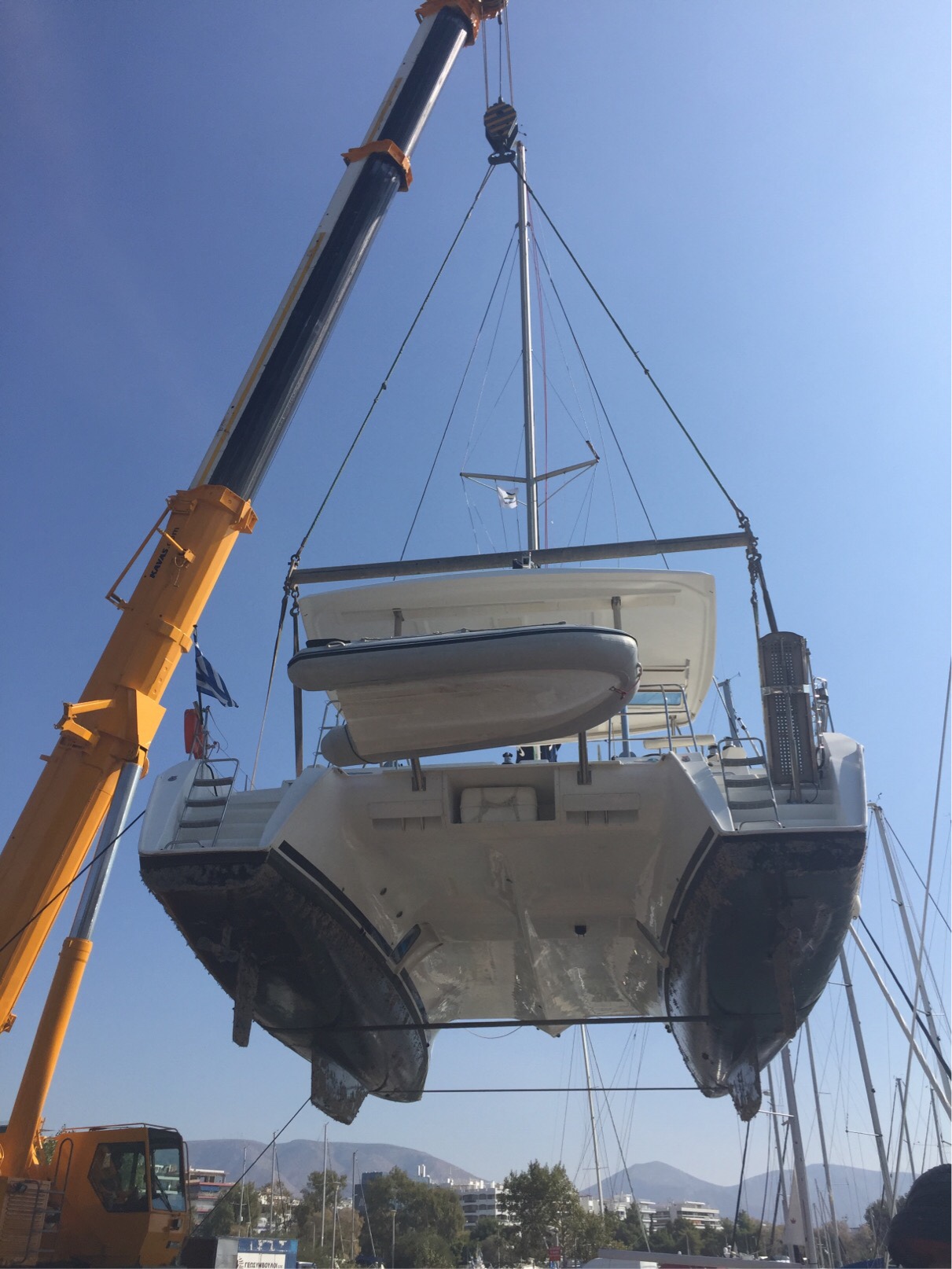 During the survey, Yiannis and Nicos between them organised the crane to lift Sunday out of the water (there is no travel lift at Alimos Marina despite there being over a thousand yachts that need being taken in and out of the water.)