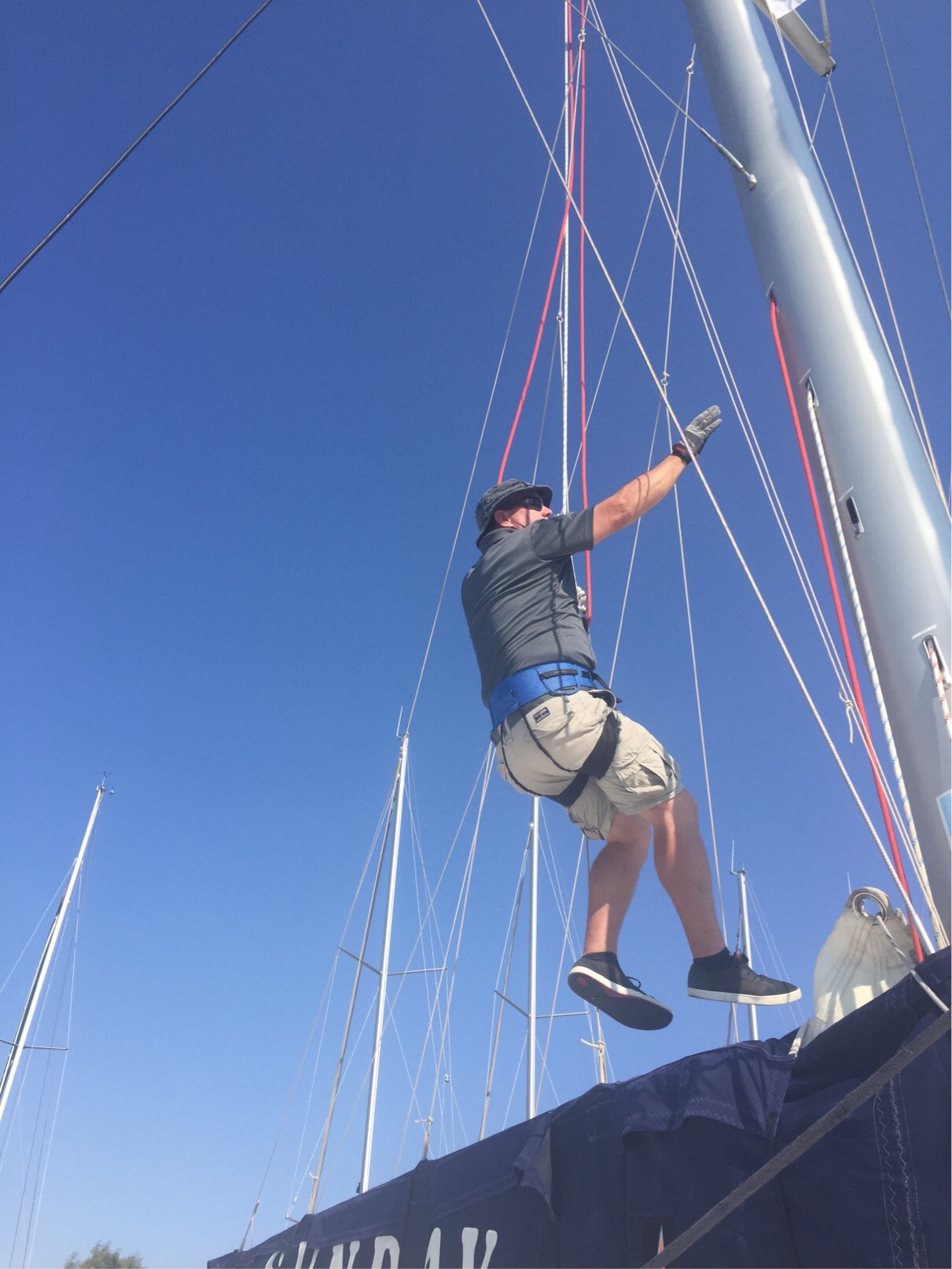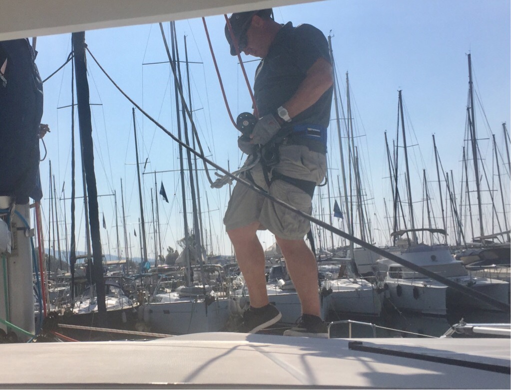 When he was hoisted up the mast though, he did find that that the forestay had two wires broken at the top swage. Nikos and Manos immediately rang up to organise a replacement forestay at their cost.