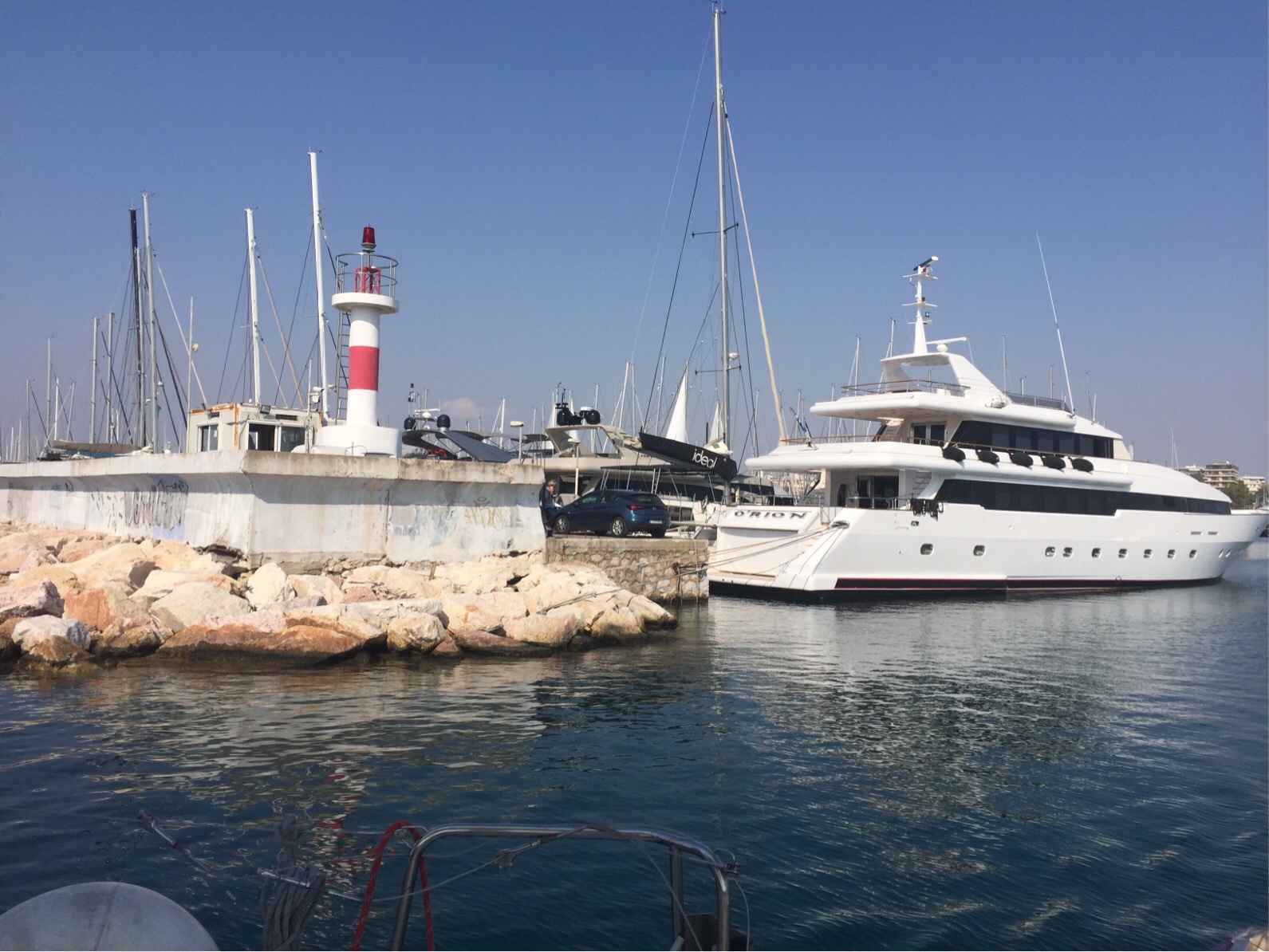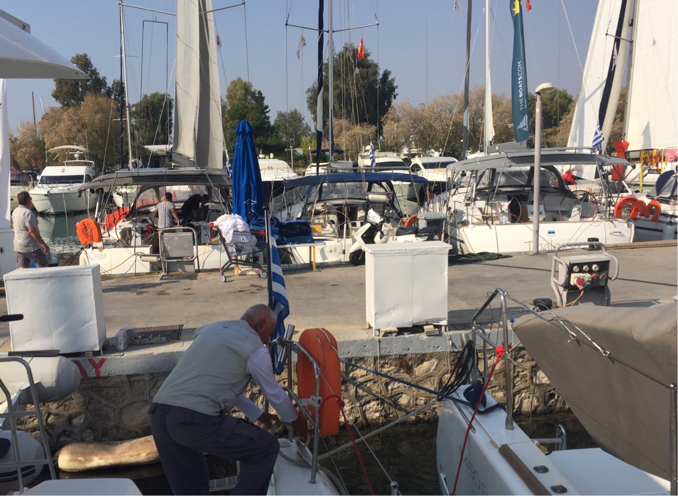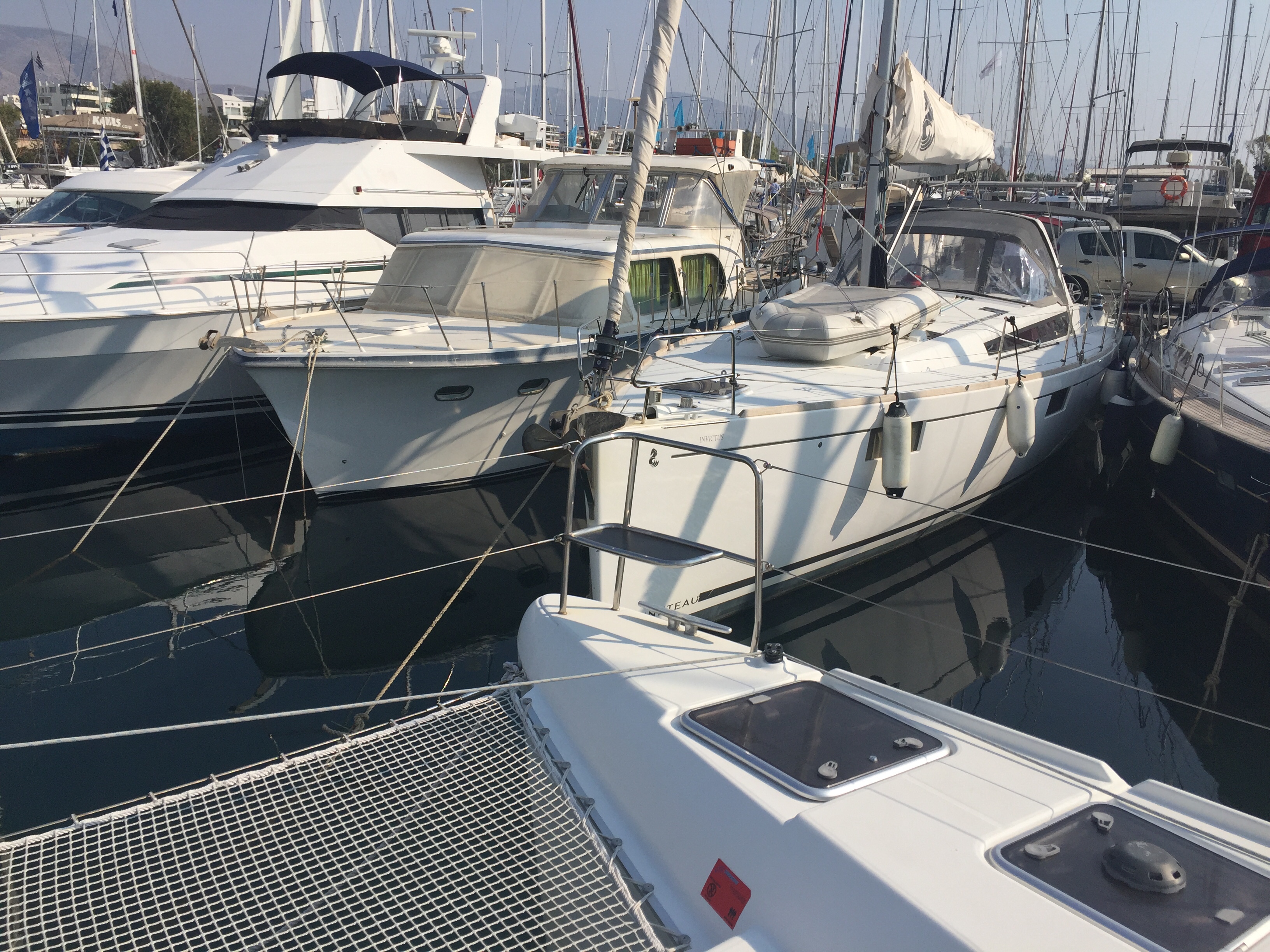 Once you’re in and tied off at the stern you pick up the lines that are attached to the sea floor and tie them off at the bow. And that’s it! When you leave the marina you literally have the length of your boat to turn in while skilfully avoiding getting your prop(s) caught in the lines attached to your neighbours’ boats (both at your side and opposite!). Note to self: we will avoid marinas at all costs while in Greece!