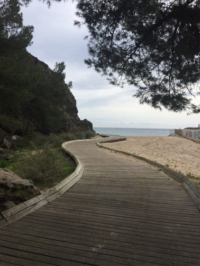 A little further along we saw an enticing boardwalk snaking it’s way on to a beach. We followed the inviting path along around a headland on to a stunning sandy beach stretching all the way to the small town of Sesimbra in the distance.