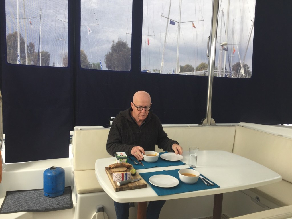 We were so happy to be back on the boat but it was strange not being allowed to leave it at all for fourteen days. During this time we enjoyed some great “lockdown” meals including wonderful Greek salads and also homemade soup as it really was quite chilly.