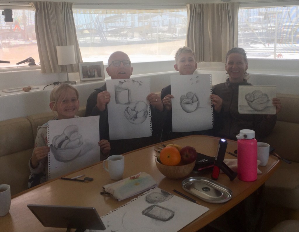 We discovered that the children Luca (13) and Nina (10) enjoyed art but all their art materials were in boxes that were still stuck in New Zealand. So Jonathan, who went to art college many moons ago and had a couple of sketchbooks and some pencils stashed away somewhere, “volunteered” to run drawing classes.