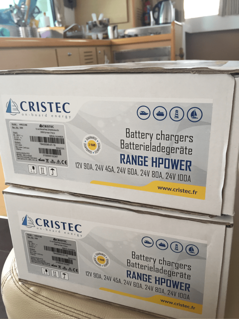 Installing the batteries and chargers was a big job. The electricians took longer than they had anticipated and had to come back the following day to do a couple of other jobs – moving a starting battery nearer to our generator, and installing a new shore power switch. The last jobs to be done and we could leave!