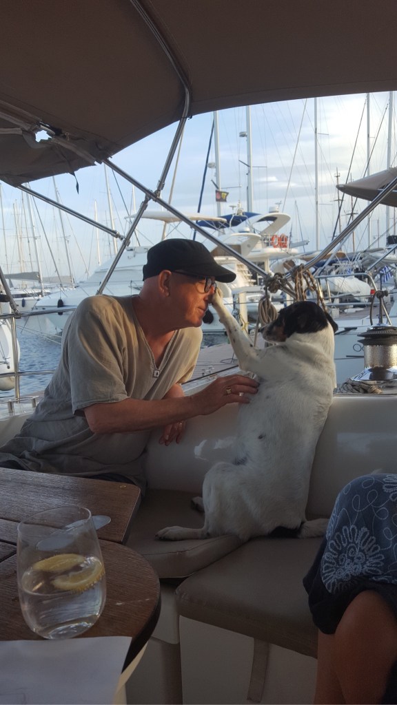 Finally, on Sunday 7 June, we were able to leave Alimos Marina and head for the island of Poros. Tim, skipper of Polykandros came to see us out and after we had let go our forward mooring lines (attached to the marina bed) and about to let go our aft lines, Lucy dog came running up and leapt across onto our electronic gang plank just as I was raising it!