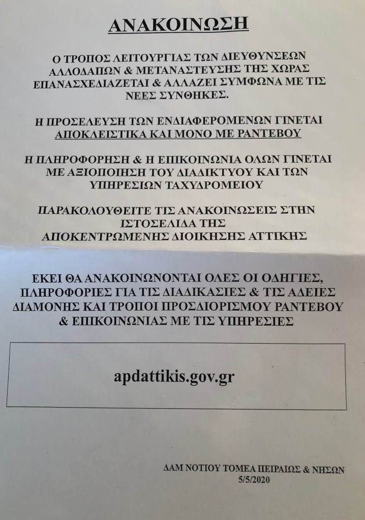 The day after our arrival in Greece the country went into complete lockdown due to Covid-19 and of course, government offices closed.
