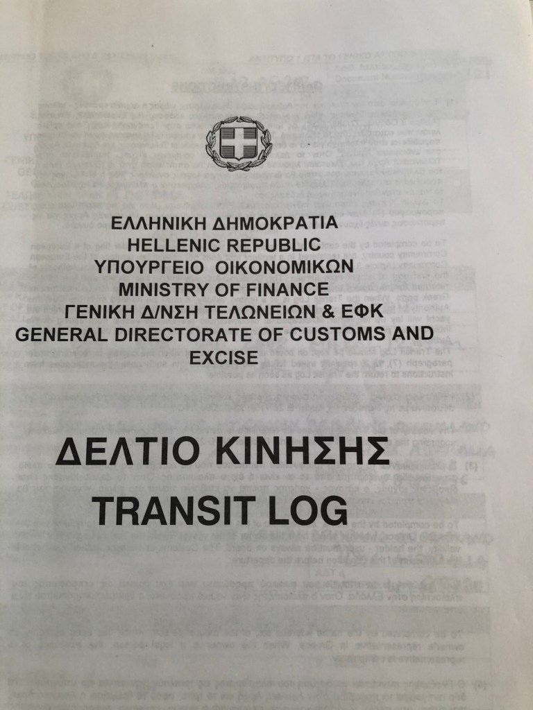 Fortunately for us the Greek Registrar was lenient – normally the actual certificate of registration is required before a transit log is issued. We were also fortunate to be issued a transit log for eighteen months as initially the Registrar was considering giving us only one month (I think because he knew our 90 days Schengen visa-free period was soon to expire and that we would have to move on quickly to a non- Schengen country.)