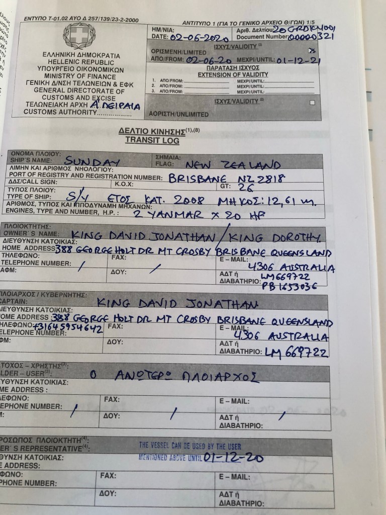In the meantime, despite being in lockdown and working from home, a lovely man from the New Zealand boat registration office processed our application to reflag Sunday in New Zealand, despite the fact we hadn’t yet received the required Greek deregistration certificate.