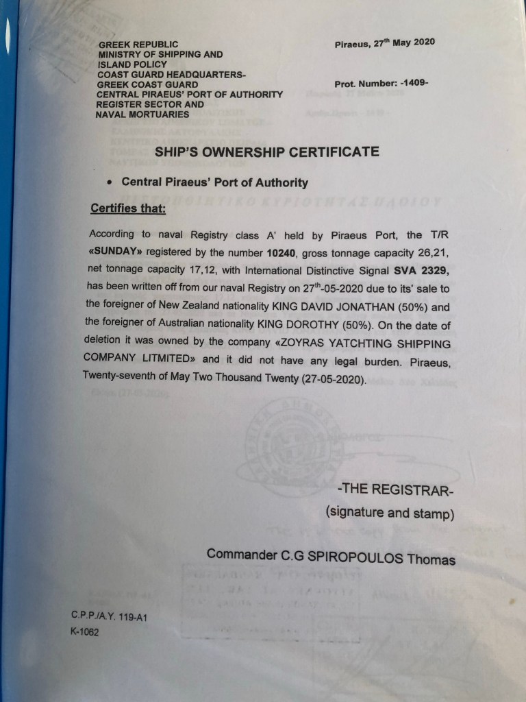 Unbelievably, the process of deregistering Sunday (taking her off the Greek register of ships and “exporting” her on paper so we can register her under the New Zealand flag) which we were told would take three weeks, was only completed last Monday – It took an unbelievable eight months!
