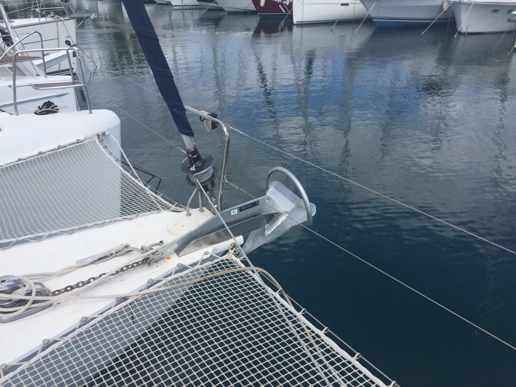From that day, we went all out to get Sunday ready to leave the marina. Now that the shops were open and trades people working, we could get on with all the jobs, big and small, that needed doing – installing our new 33 kilo Rocha anchor and new AGM batteries, plus two new Cristec 90amp chargers; buying a new dinghy and engine; arranging for our EPIRB and radio to be adjusted to show our MMSI (safety identity); buying new life jackets; getting our freezer and fridge checked and regassed; stocking up on provisions etc.