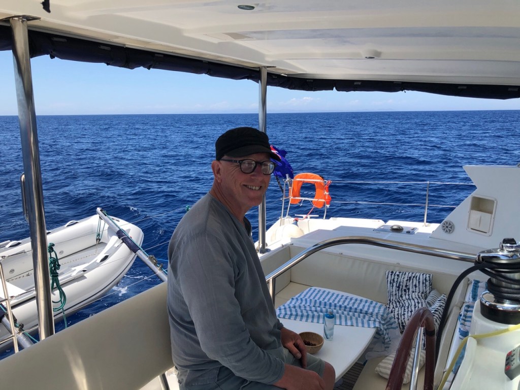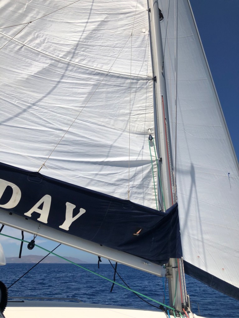 Very soon after this a lovely breeze started to ripple the ocean surface so we hoisted the sails. The main went up like a dream – after having to haul Bali Hai’s very heavy main up by hand for so long it felt extremely luxurious having a power winch to do the job for us!