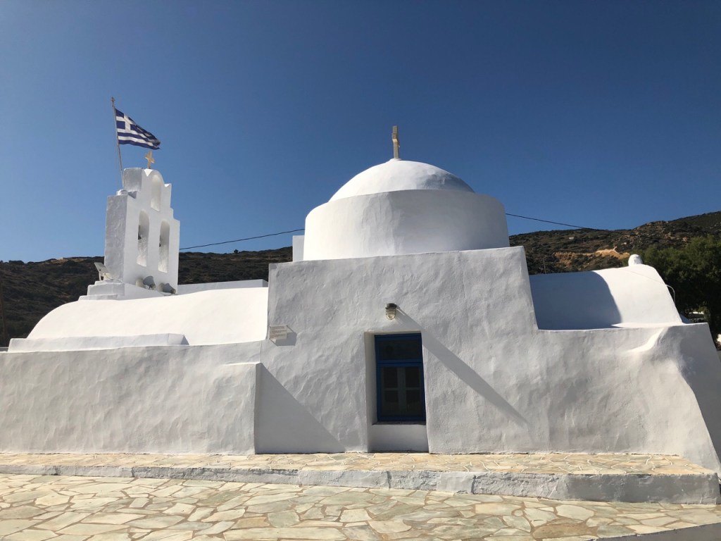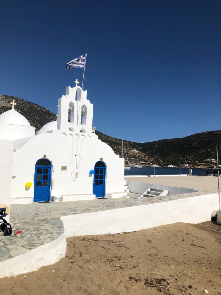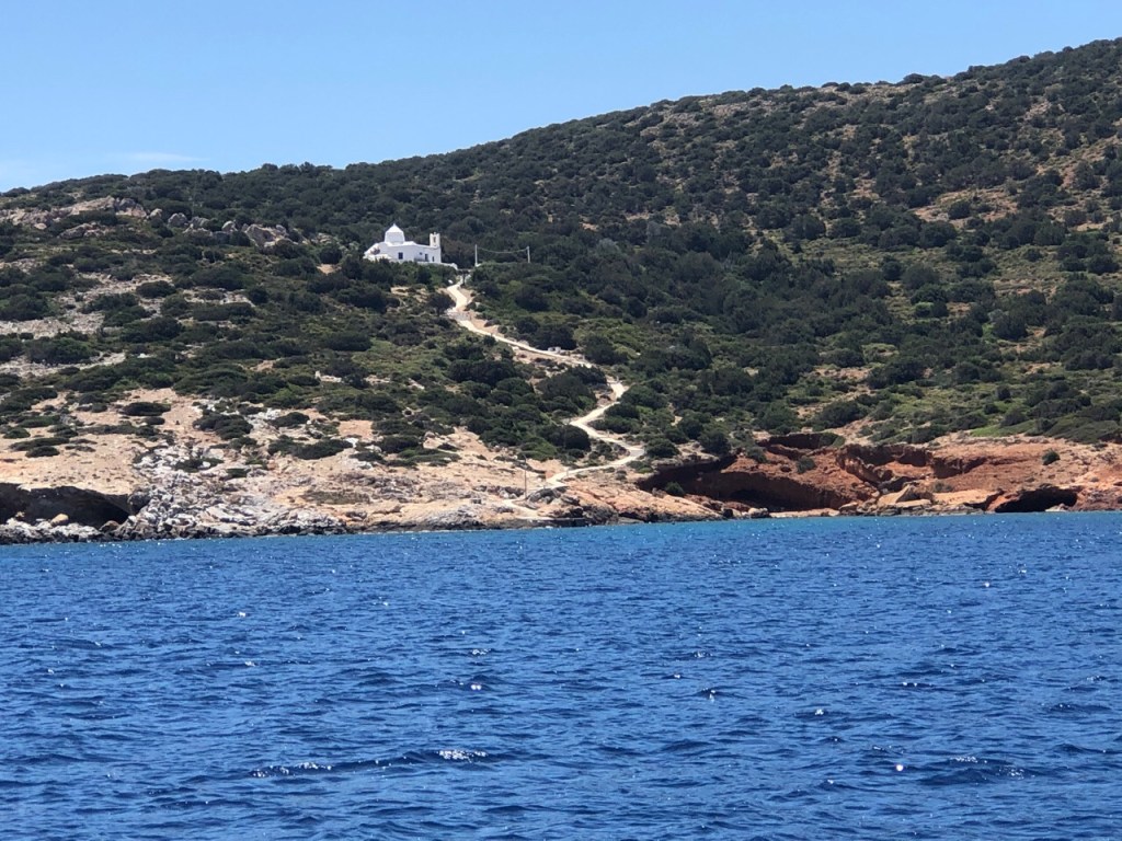 There were only two other boats in the bay – both Greek flagged – and one was moored stern-to right outside a picturesque sparkling white chapel with the signature domed roof.