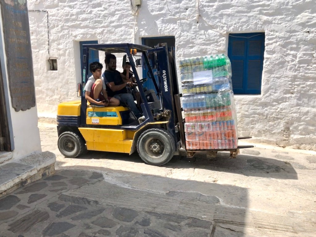 We stopped for a drink at one of the tavernas and watched the world go by – a fork lift truck making deliveries (the Main Street being too narrow for a van), a man riding a donkey, children playing.
