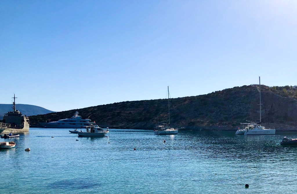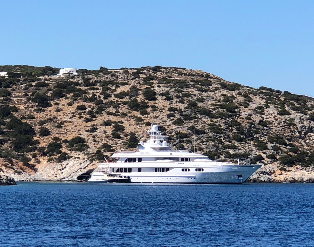 In a cove nearby, a massive super yacht lay moored Mediterranean style (bow anchor and lines ashore attached to rocks). There was one tender for the staff (there were at least ten) and a separate shiny white tender for the two guests/owners.