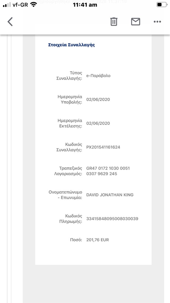 Eventually we remembered the Greek lawyer that had been employed on our behalf had sent us the receipt and we were able to show it on our phone.