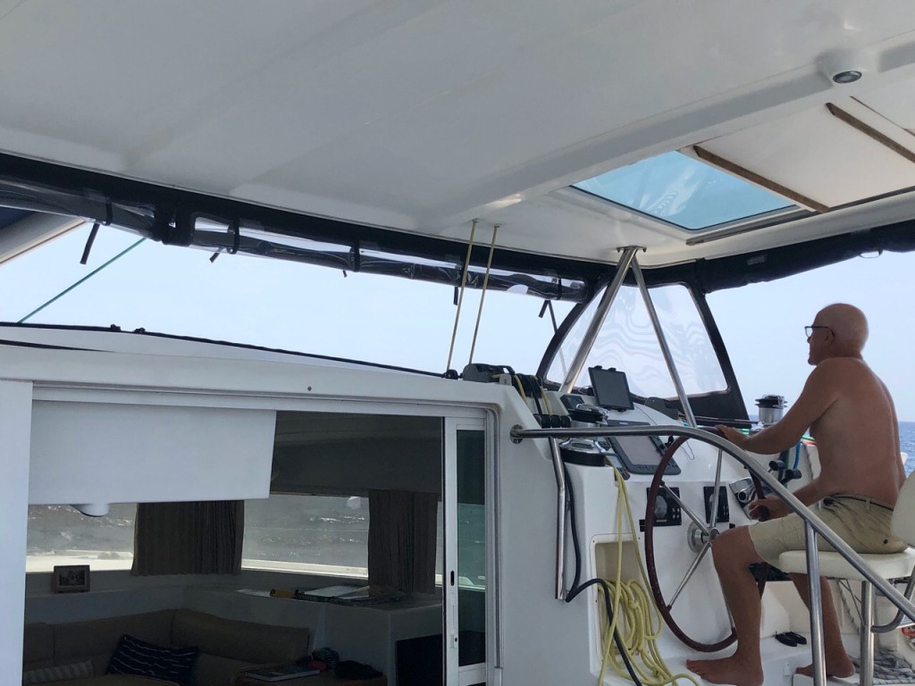 When you are sailing in a monohull it is easy to tell if you are over canvassed – for a start your boat would be leaning over more than is comfortable. In a catamaran there is no tipping over so you don’t get that warning and as this was one of the first times we had been in a bit of a blow with big seas we reduced our sail area.