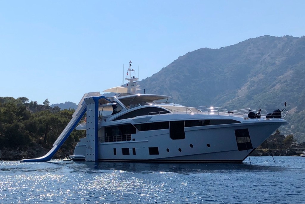 The following day a massive gulet loaded with (non socially distancing) tourists anchored/moored right next to us and we had fun watching them jumping off the boat and being taken for a whirl on a very scary looking water ride towed by a speedboat.
