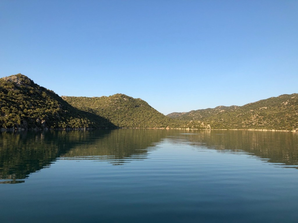 The anchorage close to the sweet village of Üçağız was as still as a lake but unlike the limpid turquoise waters we had experienced elsewhere in Turkey, the water here was opaque and green. This probably accounted for the fact that we had the whole anchorage to ourselves.