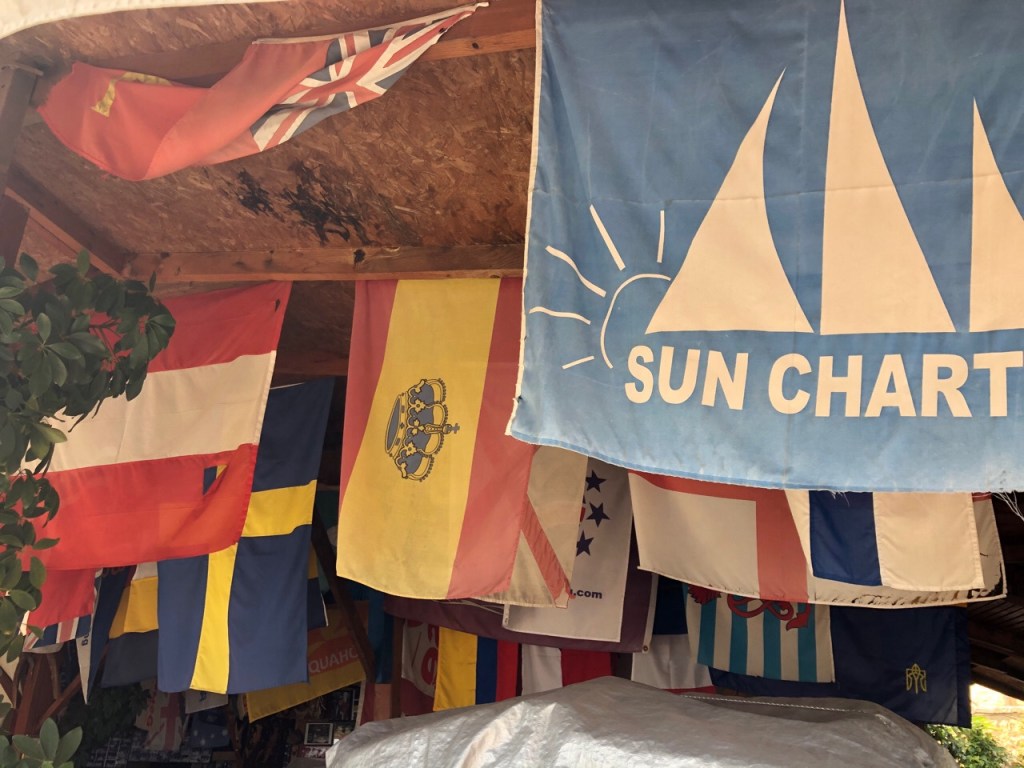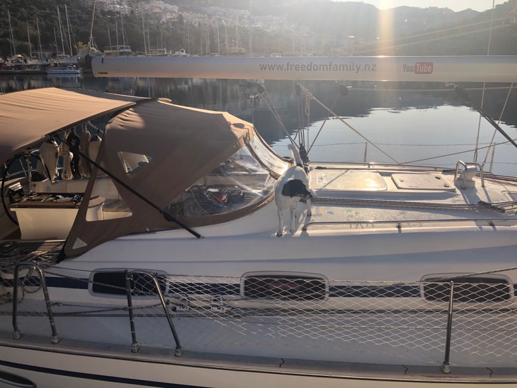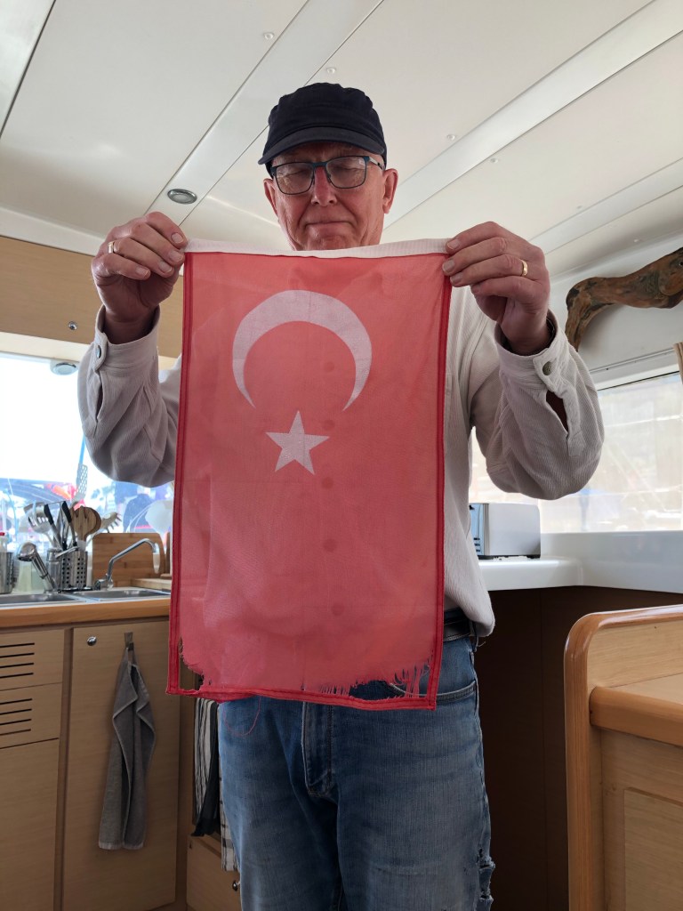The chief pointed to our Turkish courtesy flag and shook his head tut-tutting. “New, you need new”. We looked up and sheepishly agreed. It was looking very faded and rather tatty!