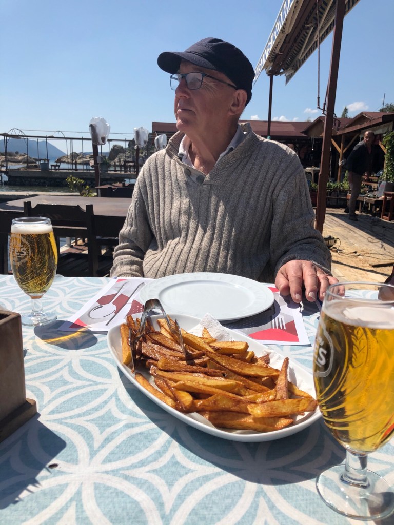 This was the first proper meal out for months (because of Covid lockdowns) so we really enjoyed ourselves. It felt like such luxury to be eating at a table in the sun, with a crisp cotton tablecloth and an ice cold beer (our first this year!) in frosty glasses straight from the fridge.