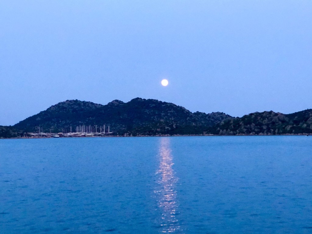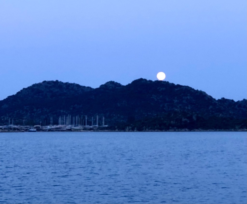 Later that day we had a last evening with the Polykandros crew. Fortunately the weather was very calm, unlike during the previous week, and we were able to sit outside and enjoy watching the almost full moon rise over the hills.