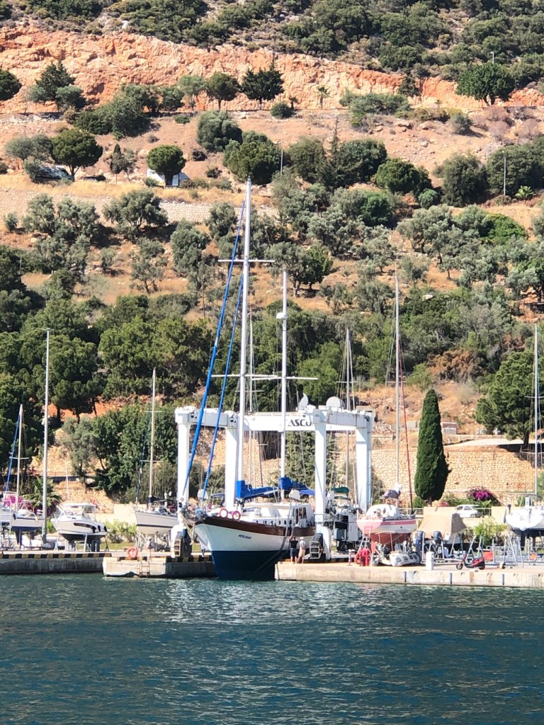 Although we have a contract which allows us to stay at all the Setur Marinas in Turkey we had already exceeded the 28-day limit at the Kas facility which is why we anchored in the sheltered cove near the marina hard standing.