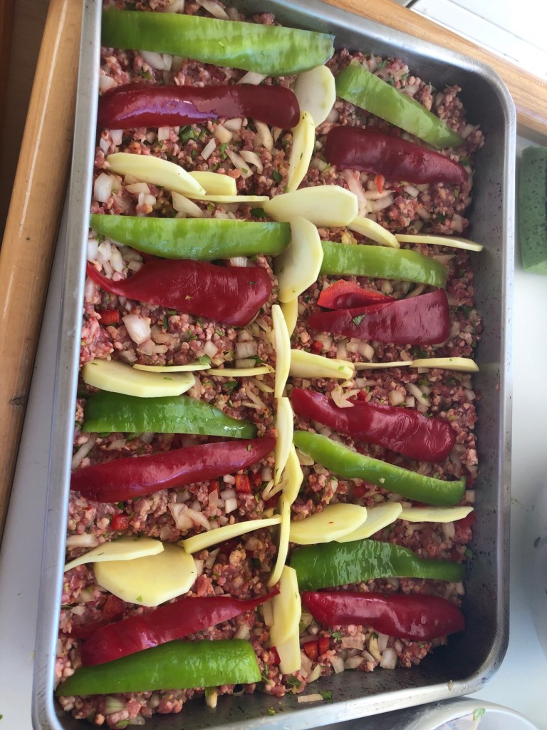 During this window of blowy weather I decided to try my hand at a popular Turkish dish Tepsi kebab (tray bake Antakya). It looked and tasted delicious but we were sadly unable to share it with Sue and John on Catabella as the weather was just too rough for them to launch their dinghy.