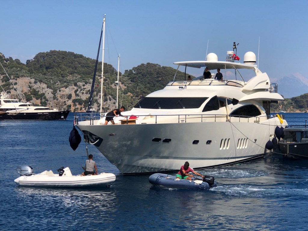 Next thing we knew their anchor had snagged Mr Okaโs chain. After much gesticulating and people whizzing around on dinghies the chain was released and the super yacht beat a hasty retreat without so much as an apology – let alone sending a crew member to assist in reanchoring/tying up.